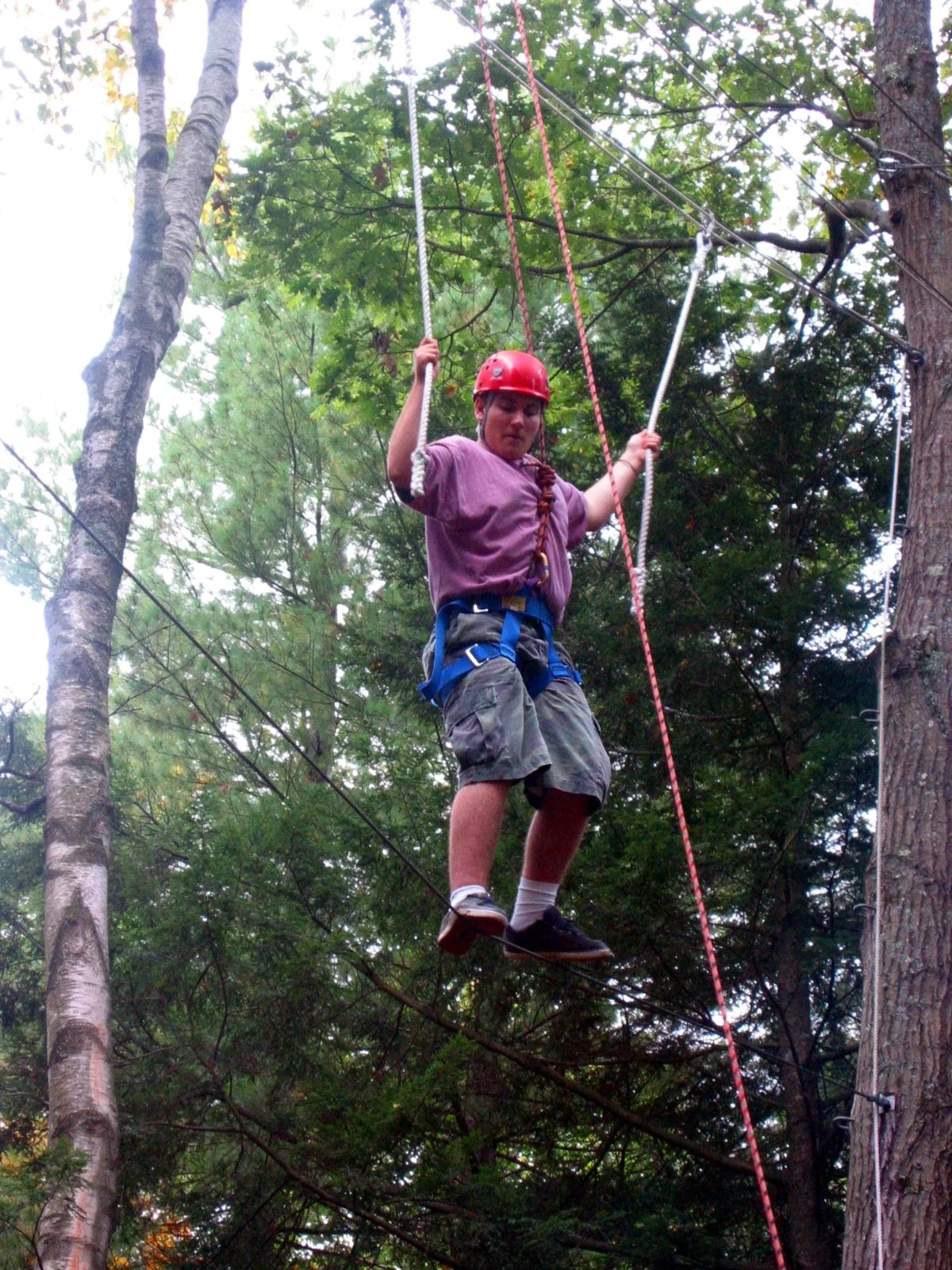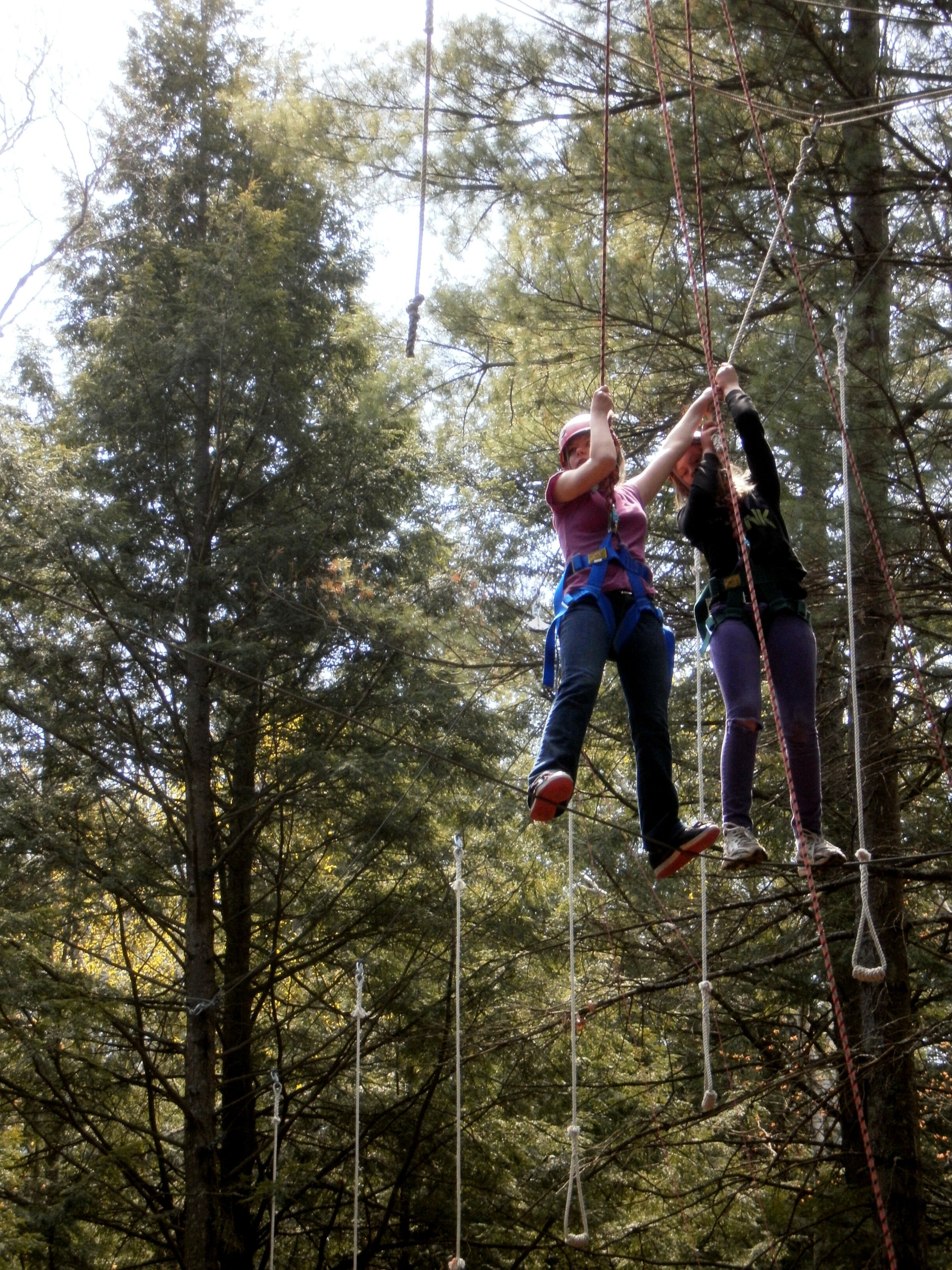 Holding onto a steady rope is very reassuring—but what about when you can’t reach the next one that lies between you and your destination? This two-person element consists of a single foot cable below a row of hanging ropes suspended between two trees: the goal is to traverse the entire cable and reach the far tree. The hanging ropes are positioned just far enough apart so that to reach the next one you must rely on your partner.