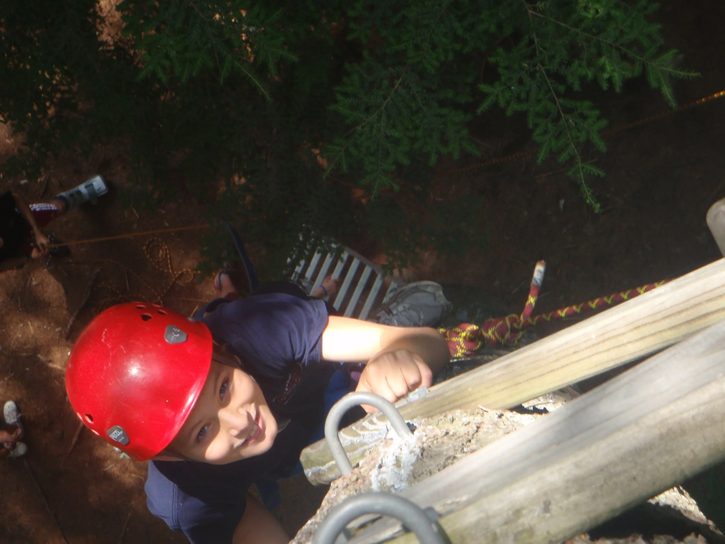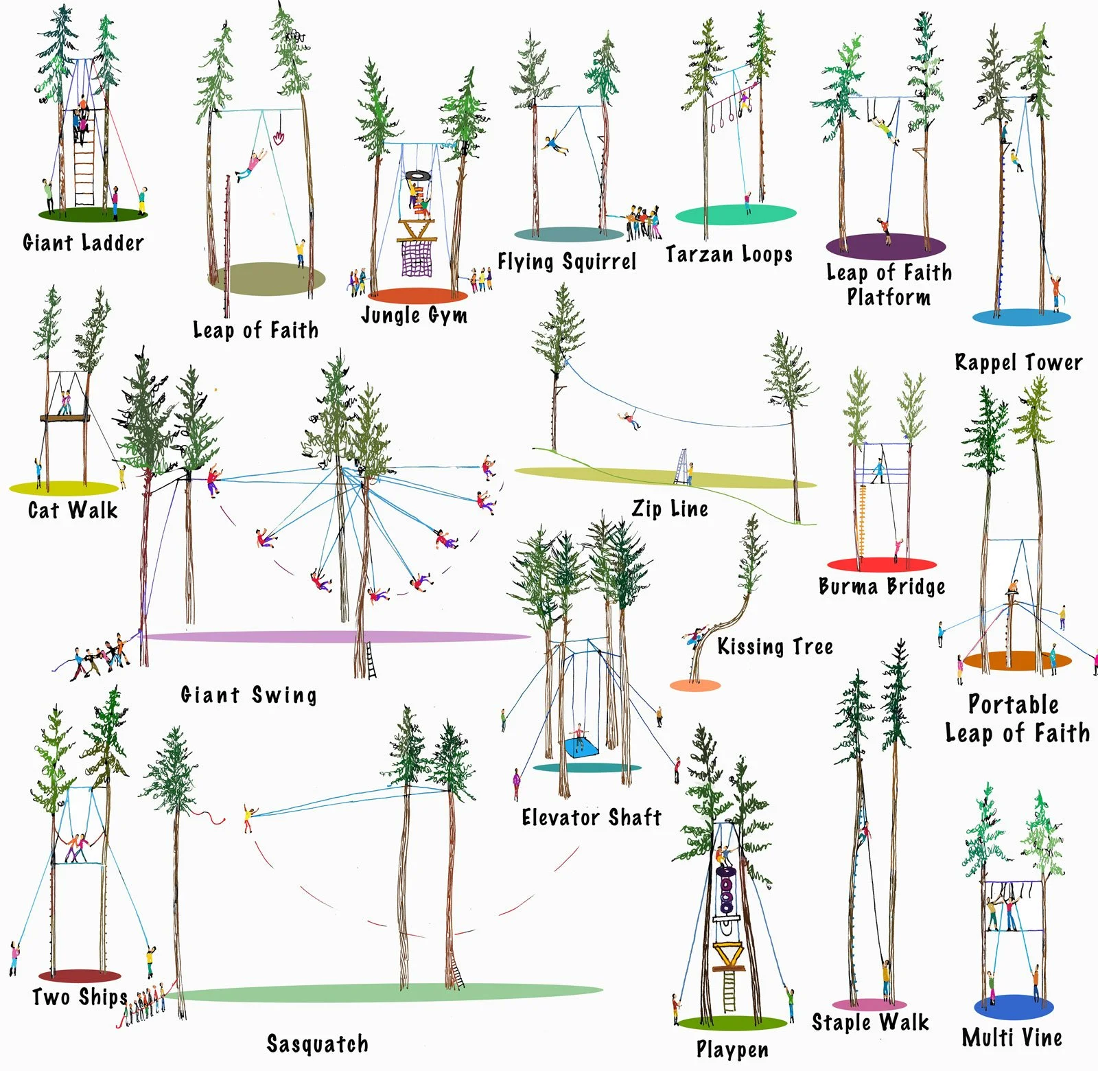 This activity involves climbing a tree to a platform and diving out to catch a trapeze suspended from a cable. Participants may move the trapeze closer or farther depending on their own level of challenge they choose.